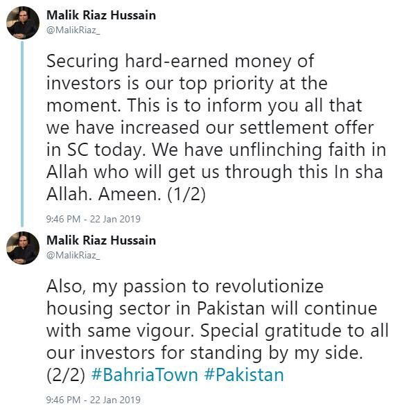 Malik Riaz, in his recent statement on social media, promised to secure his investors’ hard earned money which is invested in his Bahria Town projects.